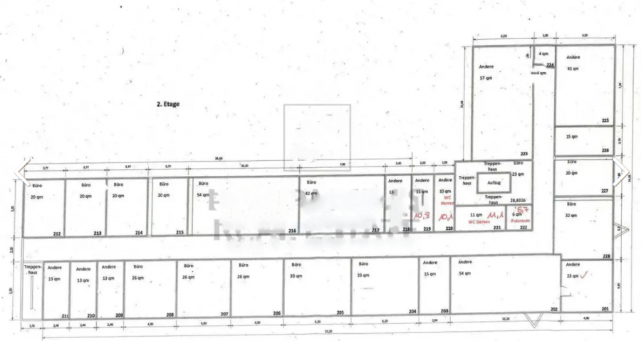 Im 2. OG befindet sich die zu vermietende Bürofläche von ca. 827 m². Der L-förmige Grundriss mit derzeit vielen Büroräumen lässt eine vielfältige Nutzungsmöglichkeit zu. Die Räume sind flexibel aufteilbar.
