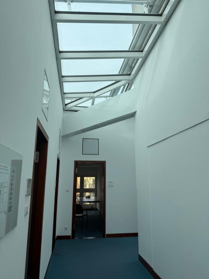 Die Räume können auf Wunsch möbliert mit USM Haller Schreibtischen, Rollcontainern und Schreibtischstühlen von Vitra sowie Multiplexregalen mit Glaseinlegeböden angemietet werden.