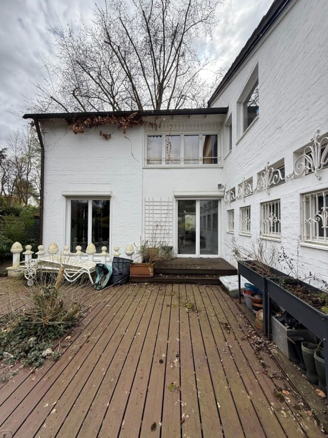 Das Grundstück, eingefriedet von einer weißen Mauer, ist mit einem großzügigen, sanierungsbedürftigen Einfamilienhaus aus dem Baujahr 1957 mit Gäste- und Garagenhaus sowie einem außenliegenden Pool bebaut. Das Haus wurde wahrscheinlich letztmalig in den 90er Jahren umgebaut und renoviert.