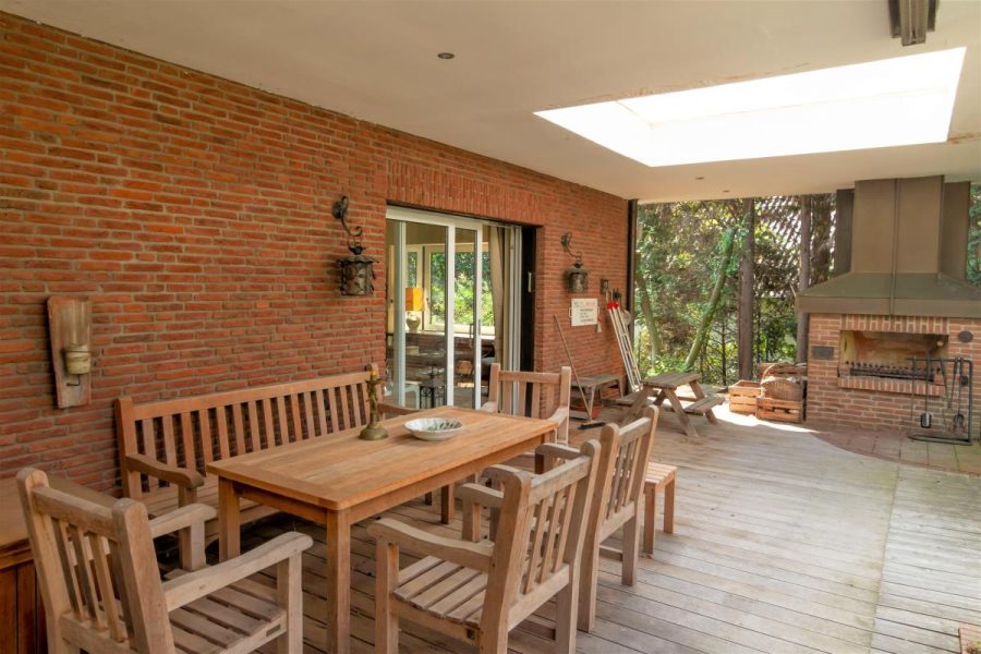 Die anschließende Terrasse verfügt über einen offenen Außenkamin, elektrische Markisen und eine zu öffnende Lichtkuppel zum Innenpool im Souterrain.