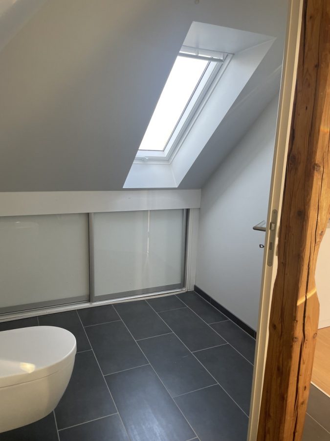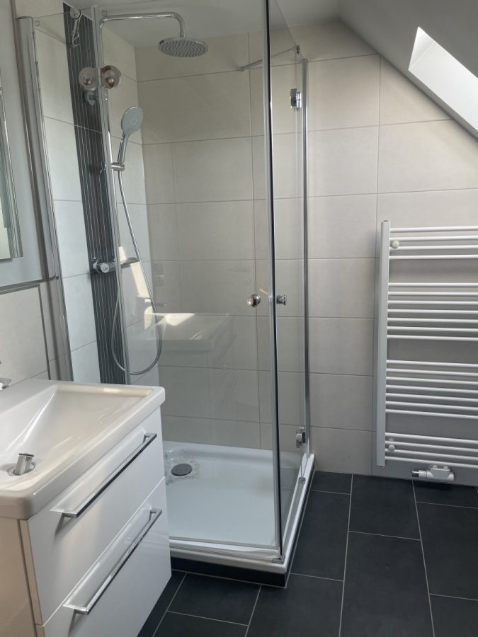 Modernes Tageslichtbad mit anthrazitfarbenen Bodenfliesen, weißen Fliesen und weißen Sanitäranlagen, Waschtisch, Dusche, Handtuchwärmer sowie einem Einbauschrank.