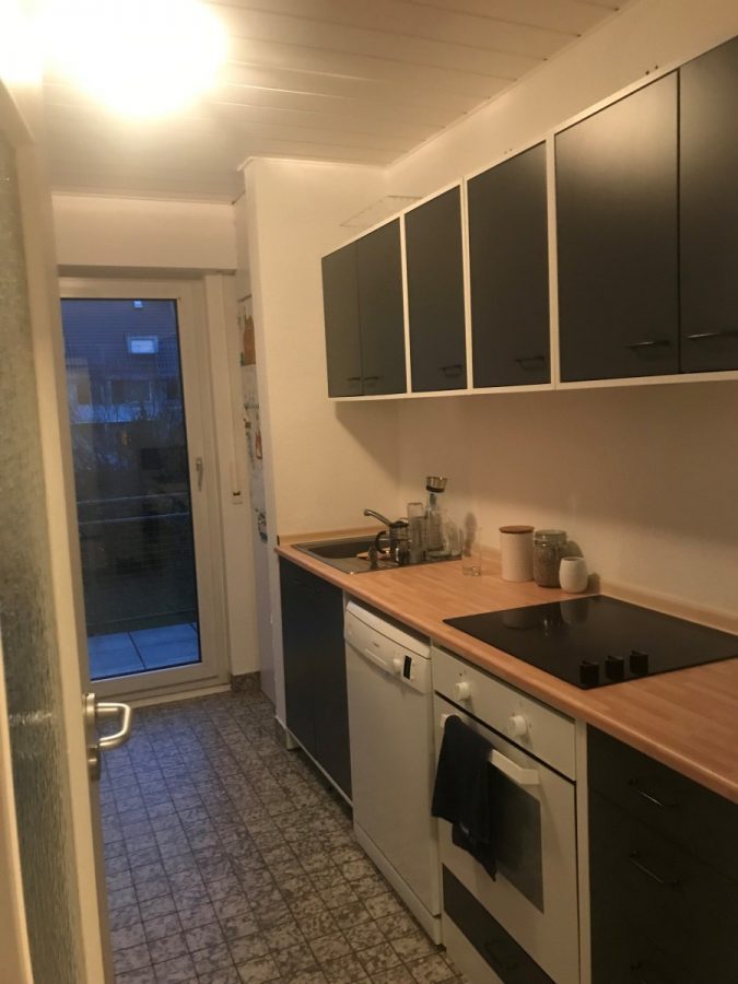 Der Fußboden im Flur sowie im Wohn- und Schlafzimmer ist mit Laminat ausgelegt. Die Küche ist gefliest.