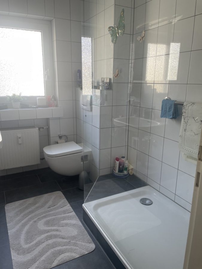 Modernes weiß gefliestes Tageslichtbad mit Dusche.