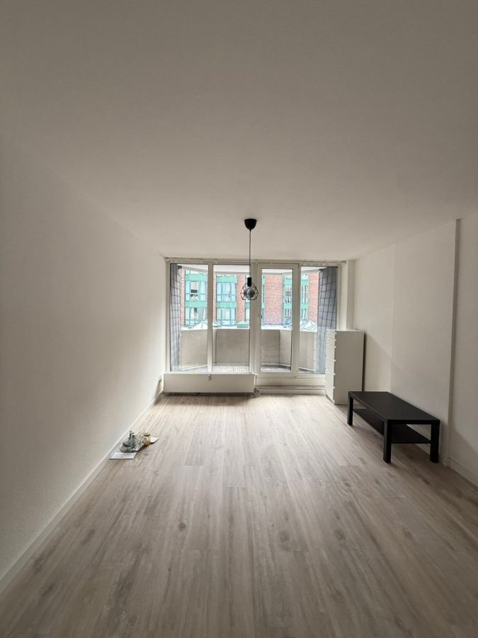 Von der Diele betreten Sie den offenen Wohn-/Ess- und Küchenbereich. Ein bodentiefes Giebelfenster bringt Licht und Helligkeit in den Wohnraum. Auf dem angrenzenden Balkon lassen sich der Kaffee am Morgen oder laue Sommerabende in der Großstadt genießen.